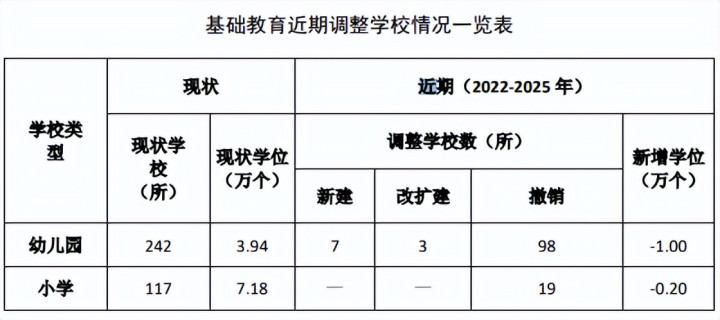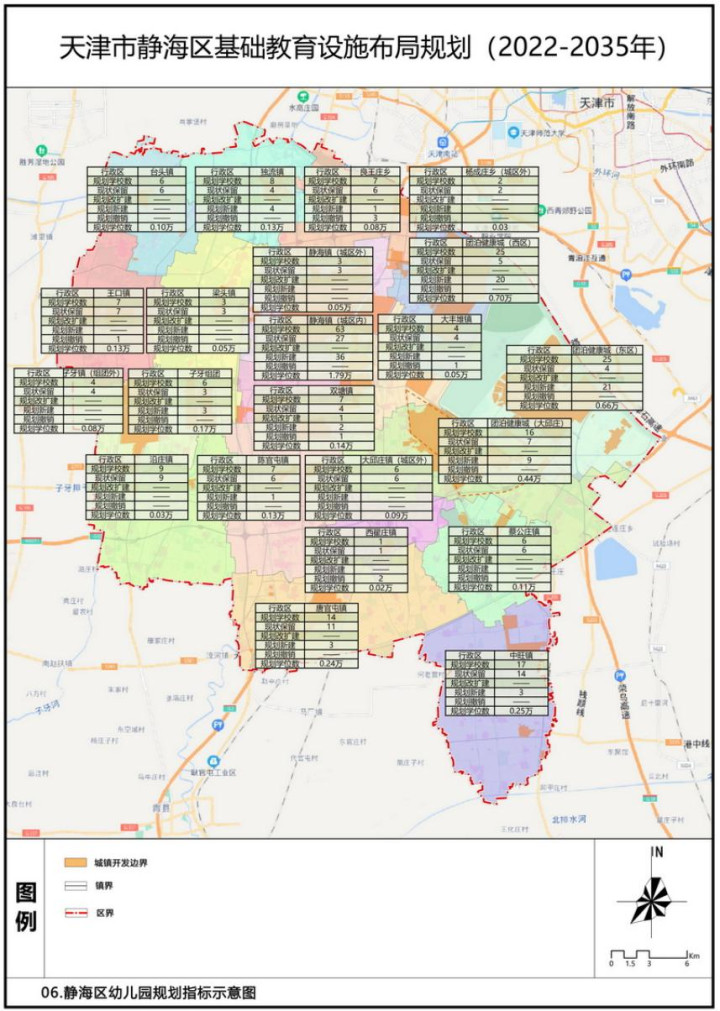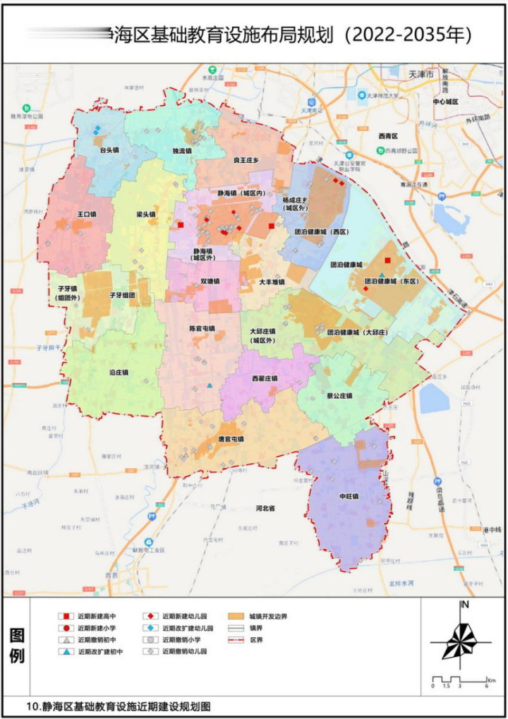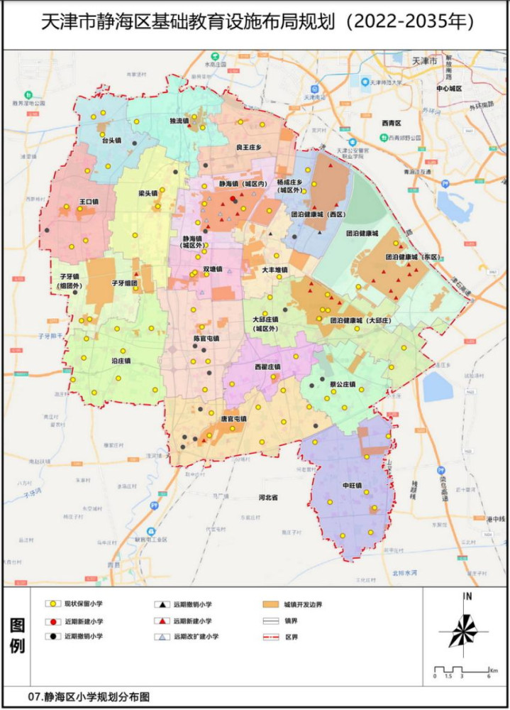 基础教育设施规划近期为2022-2025年,全区基础教育各类学校共调整52所,其中新建11所、改扩建5所、撤销118所。撤销的学校主要为小规模托幼点、幼儿园和乡镇小学分校区;新建学校主要位于静海城区及团泊地区。
