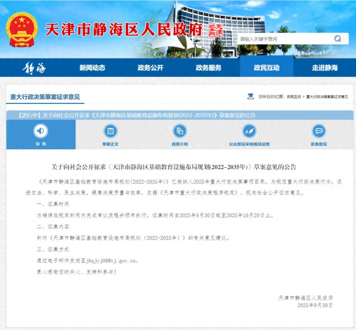 近日,静海区人民政府网站发布“关于向社会公开征求《天津市静海区基础教育设施布局规划(2022-2035年)》草案意见的公告”。根据规划,至2035年,静海区基础教育学校从现状的408所增加至440所。